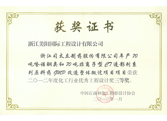 荣获2012年度化工行业优秀工程设计奖三等奖
